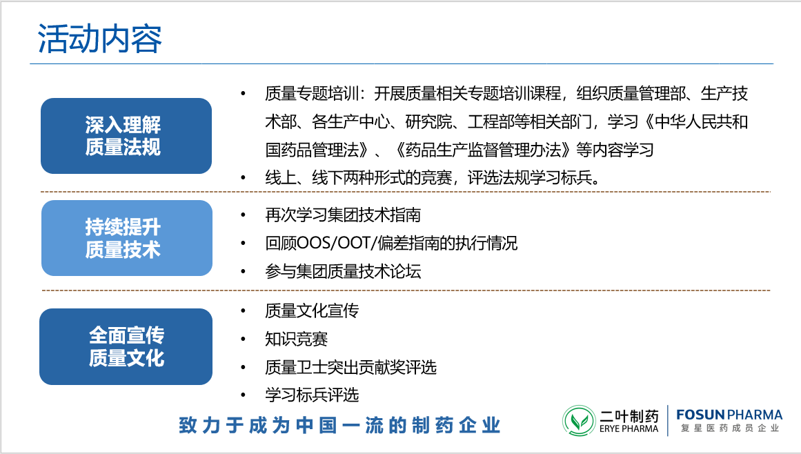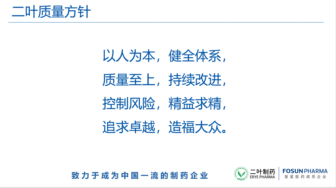 來源: 發(fā)布時(shí)間:2020-09-15 11:31:00 為貫徹復(fù)星醫(yī)藥“尊重生命,質(zhì)量為先,精益求精,追求卓越”的質(zhì)量方針,提升全員質(zhì)量意識(shí)及質(zhì)量能力,踐行復(fù)星醫(yī)藥“質(zhì)量為先”的質(zhì)量文化,根據(jù)復(fù)星醫(yī)藥〔2020〕號(hào)《關(guān)于開展復(fù)星醫(yī)藥 2020 年“質(zhì)量管理月”活動(dòng)的通知》文件精神,二葉制藥將于2020年9月至10月開展為期兩個(gè)月的質(zhì)量管理月活動(dòng)。