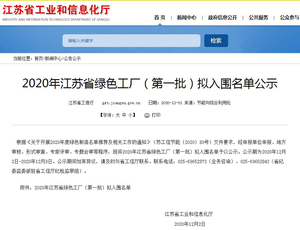 近日,省工信廳公布了2020年江蘇省綠色工廠(第一批)企業(yè)名單,我司成功入圍。